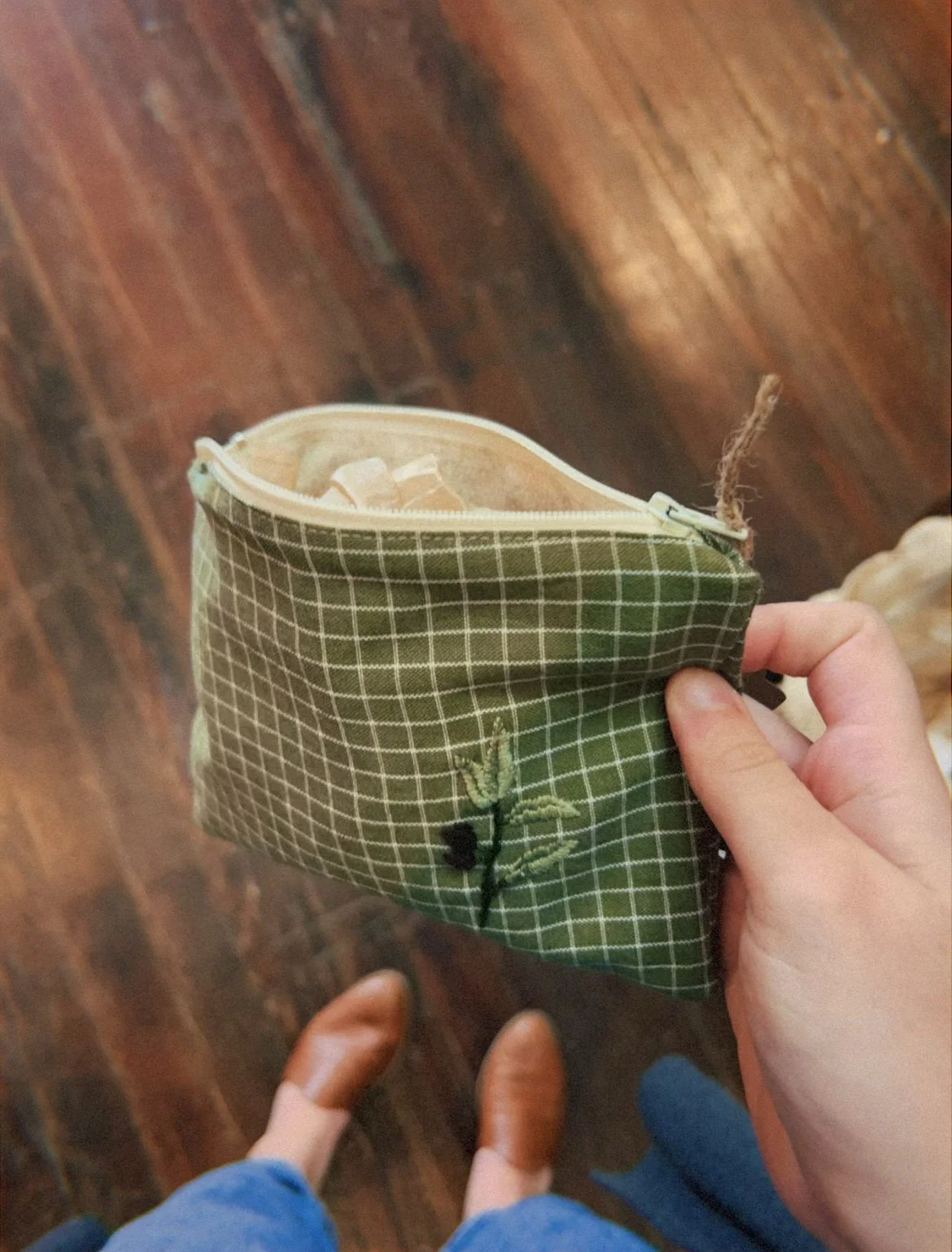 Discover the beauty of accessories, with our charming, hand-stitched bags, designed to add a touch of elegance to your everyday essentials. Featured above is Our Green Grid Floral Purse, with delicate white tulips and our signature olive branch. 🌱